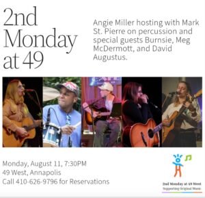 August 11 info: Angie Miller hosting with Mark St. Pierre on percussion and special guests Burnsie, Meg McDermott, and David Augustus