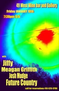 Come join us Friday January 10th for a night of sparked acoustic sounds and swaying electric soundscapes with Future Country, Josh Mudge, Meagan Griffith and Jiffy. Music begins at 7:30pm call for a reservation today!