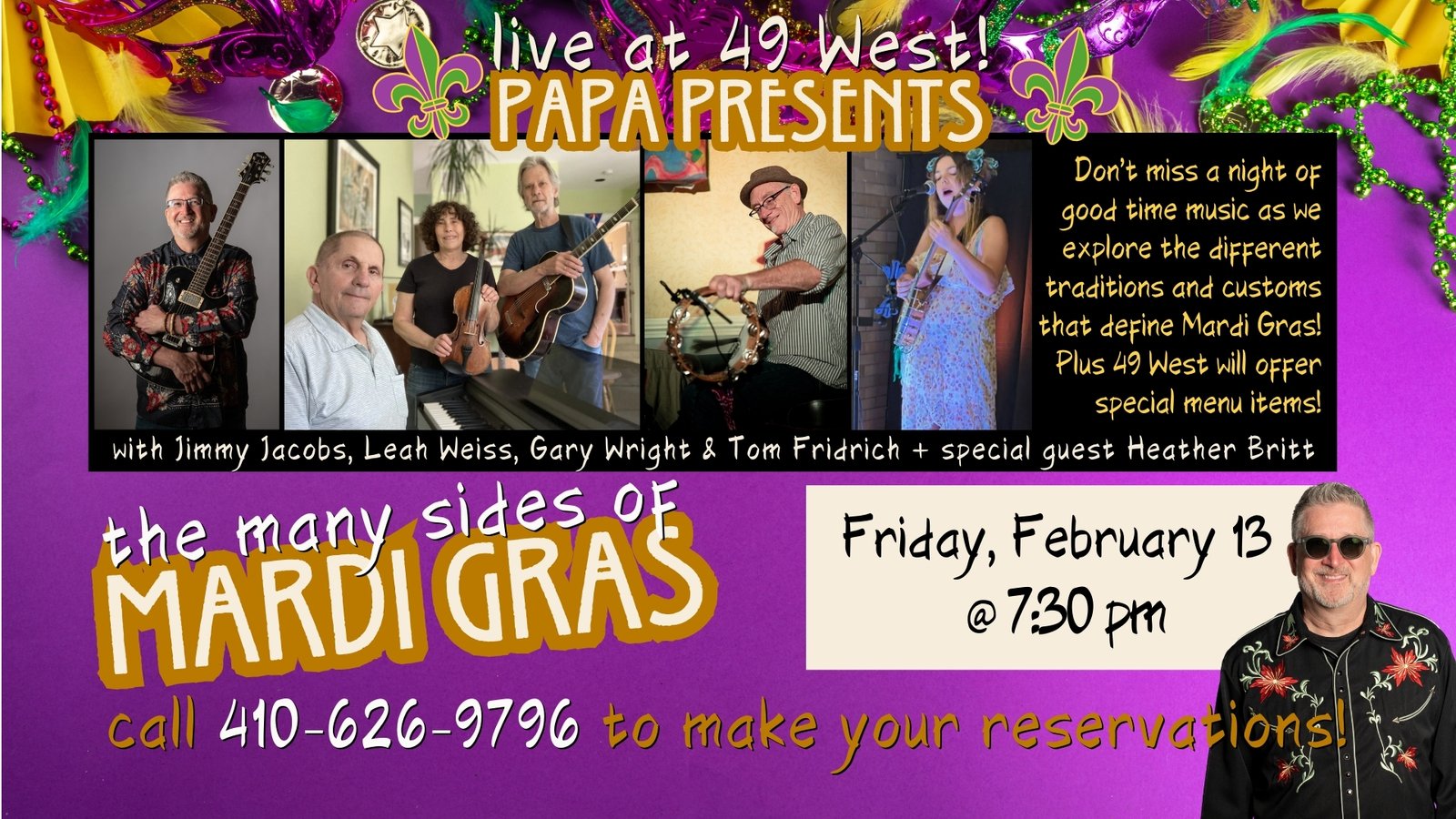 Don’t miss a night of good time music as we explore the different traditions and customs that define Mardi Gras. Along with the tasty Cajun and Creole classics the band will perform, 49 West will offer some special Louisiana menu items that evening! This month’s all-star band includes Leah Weiss (vocals, fiddle & bass), Gary Wright (vocals & guitar), Jimmy Jacobs (piano), Jeff Muller (vocals, bass & guitar), and Tom Fridrich (vocals & jambourine) plus special guest Heather Britt (vocals). $20 cover. Reservations are highly recommended as these shows typically sell out. Call 49 West at 410-626-9796 to reserve your seat today!