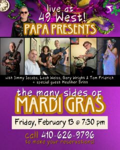 Don’t miss a night of good time music as we explore the different traditions and customs that define Mardi Gras. Along with the tasty Cajun and Creole classics the band will perform, 49 West will offer some special Louisiana menu items that evening! This month’s all-star band includes Leah Weiss (vocals, fiddle & bass), Gary Wright (vocals & guitar), Jimmy Jacobs (piano), Jeff Muller (vocals, bass & guitar), and Tom Fridrich (vocals & jambourine) plus special guest Heather Britt (vocals). $20 cover. Reservations are highly recommended as these shows typically sell out. Call 49 West at 410-626-9796 to reserve your seat today!