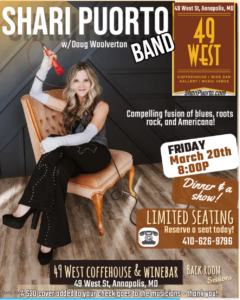 Shari is proud to perform alongside her partner, Doug Woolverton, who is currently touring with Kenny Wayne Shepherd. A Grammy- and Emmy-nominated musician, Doug brings decades of experience, including ten years performing with the legendary Roomful of Blues band. More info on Shari at, Www.BluesRockMusic.com