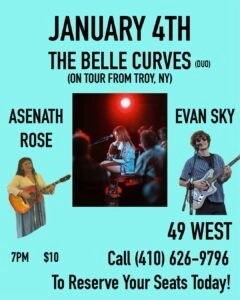 Please join Evan Sky & Asenath Rose for an evening of amazing music. Call for your reservations at 410-626-9796 to reserve your seat!